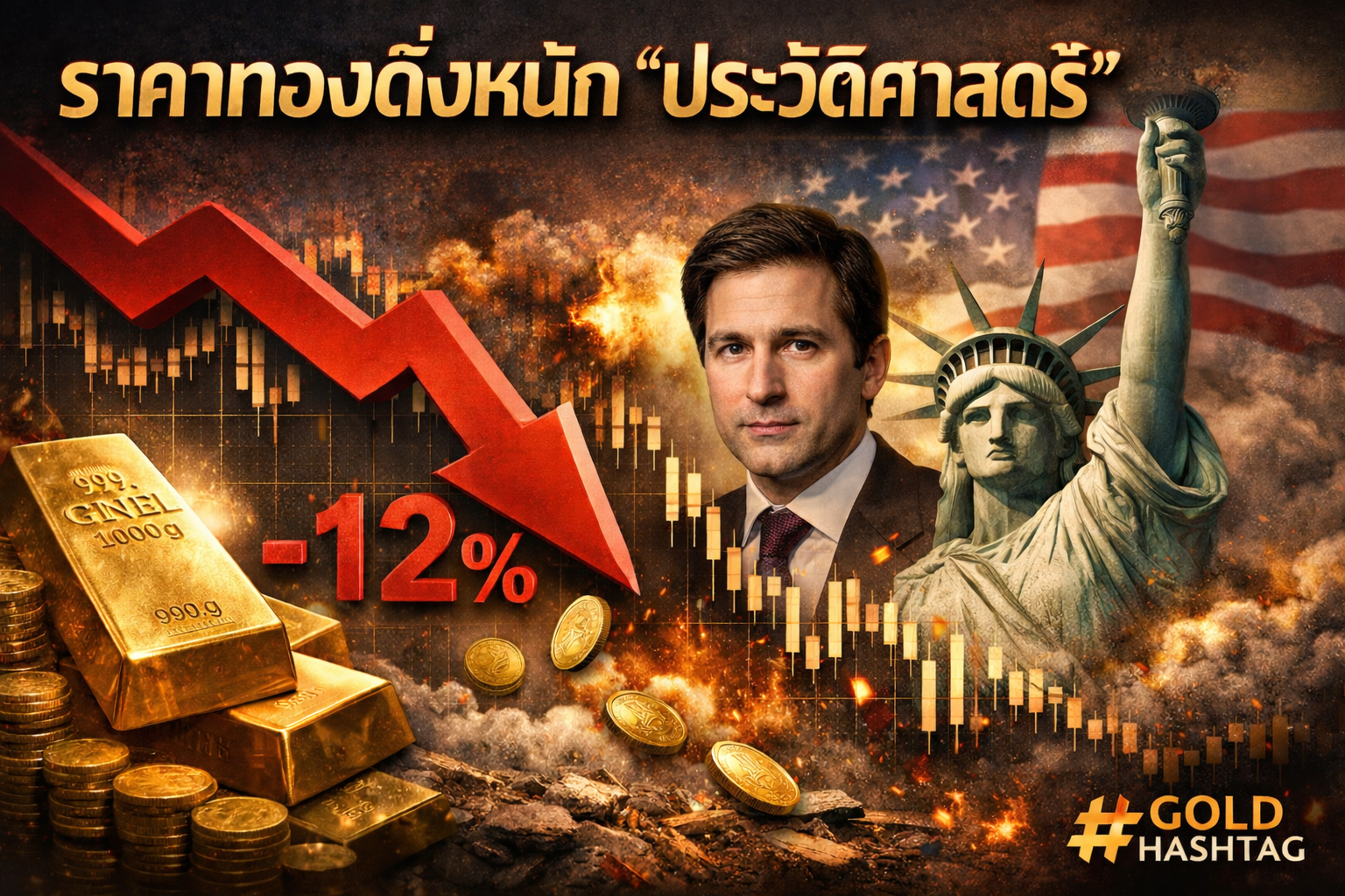 ช่วงเดือนกุมภาพันธ์ 2569 ตลาดทองคำทั่วโลกเผชิญแรงเทขายอย่างรุนแรง จนเกิดภาวะที่หลายสำนักเรียกว่า “ดิ่งหนักเป็นประวัติศาสตร์” หลังราคาทองคำโลก (Gold Spot) ปรับตัวลดลงมากถึง -12% ภายในวันเดียว ซึ่งถือเป็นการร่วงแรงที่สุดในรอบกว่า 46 ปี